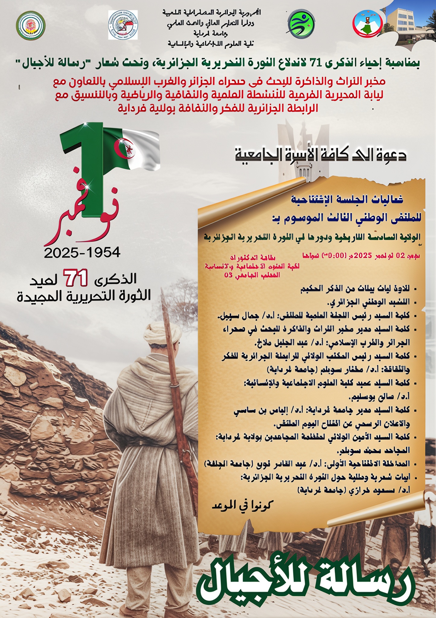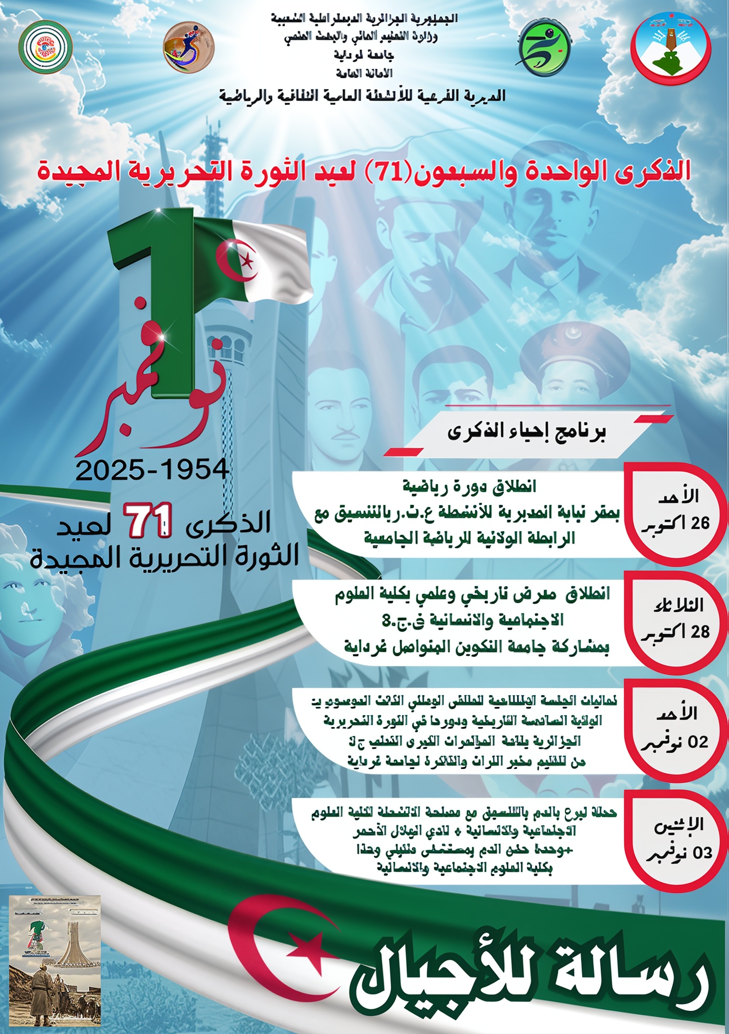 احياء الذكرى 71 لاندلاع الثورة التحريرية المجيدة 23 أكتوبر 2025 إعلانات, المديرية الفرعية للأنشطة العلمية والثقافية والرياضية, مقالات مميزة 18 زيارة اعلانات احياء الذكرى 71 لاندلاع الثورة التحريرية المجيدة شاركها Facebook Twitter LinkedIn