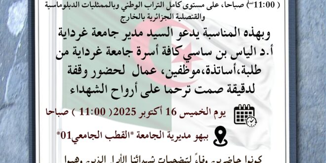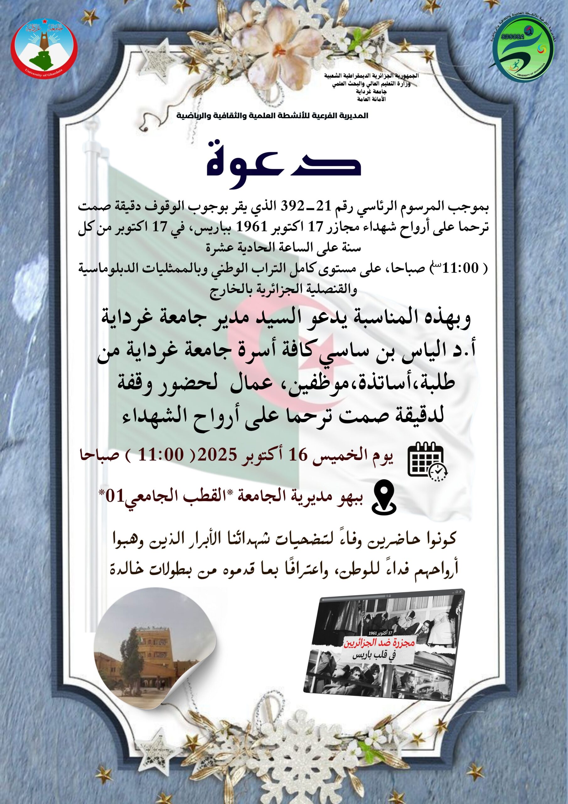 دعوة وقفة لدقيقة صمت ترحما على شهداء مجازر 17 اكتوبر 1961 بباريس 14 أكتوبر 2025 أخبار الجامعة, الأمانة العامة, المديرية الفرعية للأنشطة العلمية والثقافية والرياضية 10 زيارة دعوة وقفة لدقيقة صمت ترحما على شهداء مجازر 17 اكتوبر 1961 بباريس شاركها Facebook Twitter LinkedIn