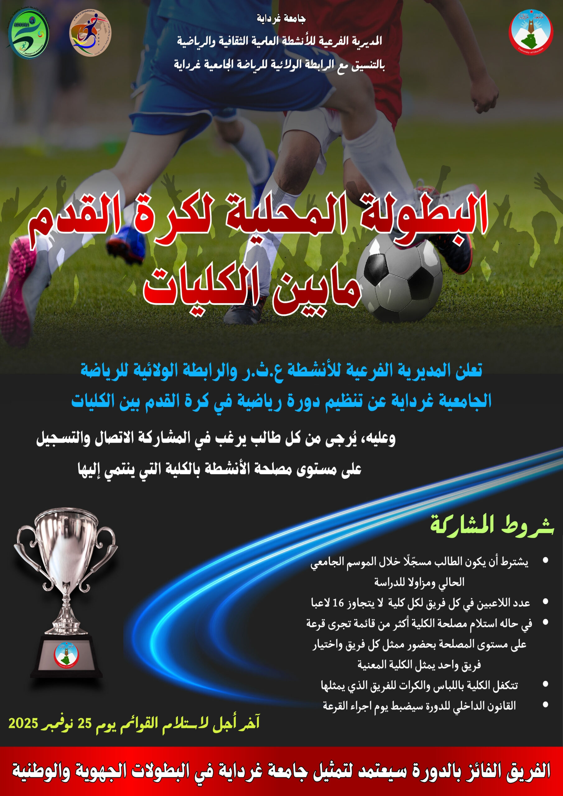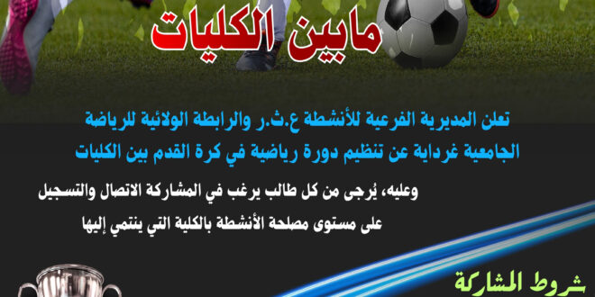 البطولة المحلية لكرة القدم ما بين الكليات 20 نوفمبر 2025 إعلانات, المديرية الفرعية للأنشطة العلمية والثقافية والرياضية, مقالات مميزة 11 زيارة البطولة المحلية لكرة القدم ما بين الكليات Red Black and White Dynamic Volleyball Championship Instagram Poتنزيل شاركها Facebook Twitter LinkedIn