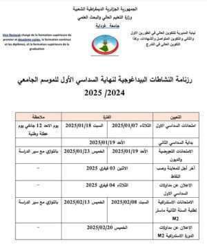 رزنامة النشاطات البيداغوجية لنهاية السداسي الأول للموسم الجامعي 2024/ 2025